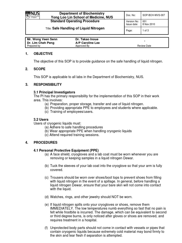 Standard Operating Procedure for Safe Handling of Liquid Nitrogen Liquid Nitrogen Handling Safety learn how to handle liquid nitrogen safely in food and beverage service, cryotherapy, and other applications. Protective gloves that can be. learn about the potential hazards of nitrogen gas and liquid, such as oxygen deficiency, asphyxiation, and cold burns. protect your eyes with safety goggles and cover skin to prevent contact with the liquid or cold gas.. Liquid Nitrogen Handling Safety.